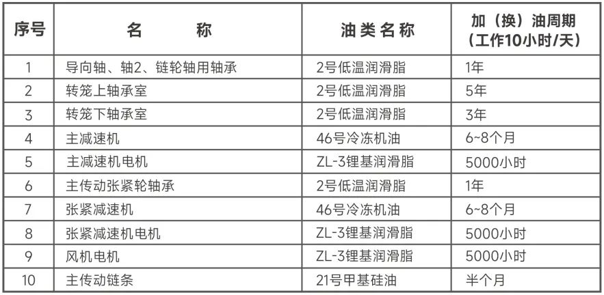 · 日常維護(hù)與保養(yǎng)的項(xiàng)目,特別是減速機(jī)和電動機(jī)的維護(hù)與保養(yǎng),請認(rèn)真參照設(shè)備說明書執(zhí)行。