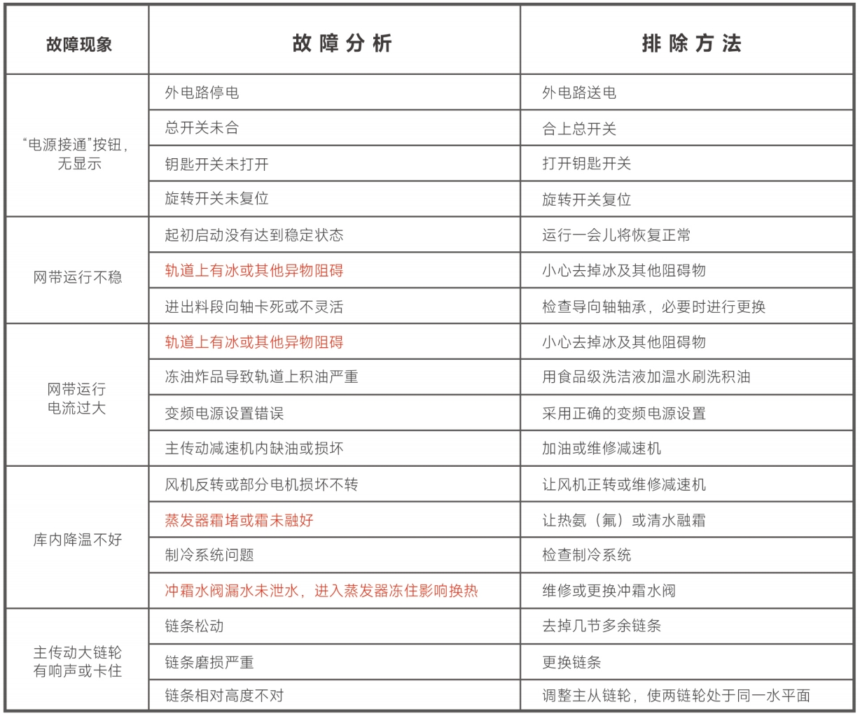 4.禁止當(dāng)日工作結(jié)束或中途停機(jī)吃飯,保住庫溫,稍后或次日繼續(xù)使用,會導(dǎo)致網(wǎng)帶凍住,造成傳動電機(jī)電流增大和拉傷網(wǎng)帶事故。